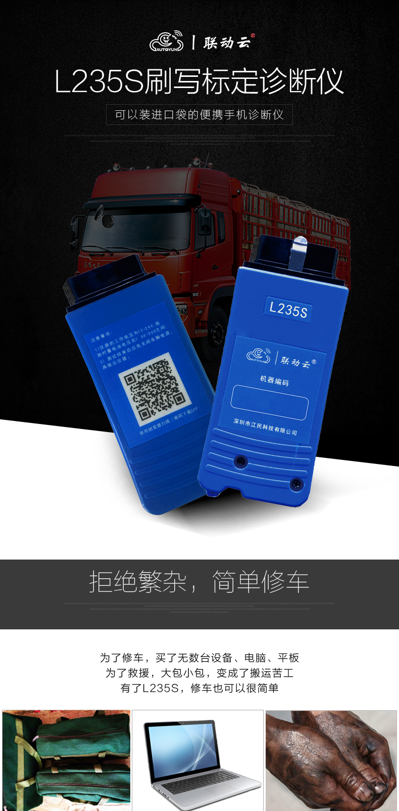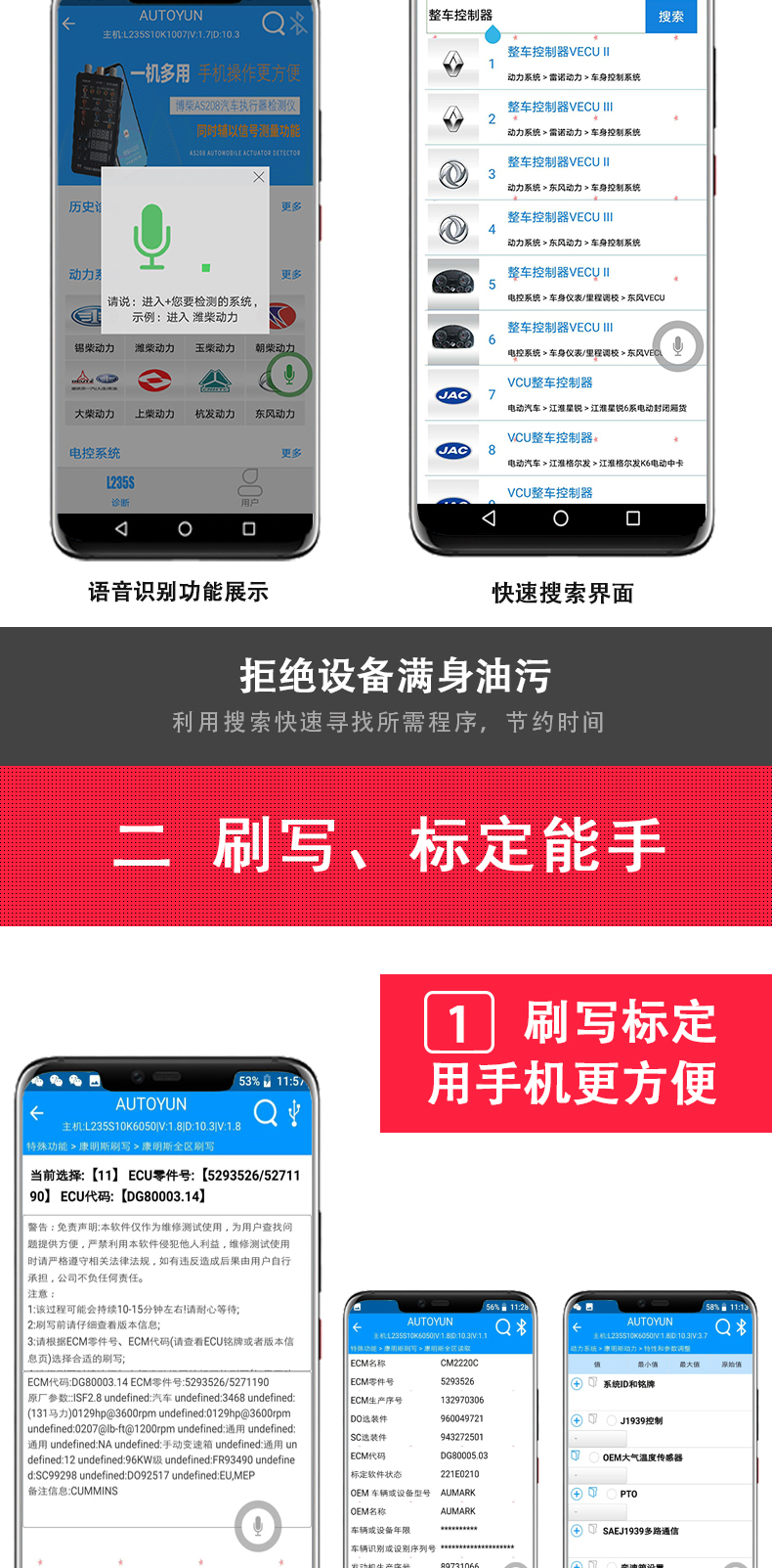聯(lián)動(dòng)云L235S智能語(yǔ)音版手機(jī)診斷儀開(kāi)創(chuàng)商用車診斷便捷化,一個(gè)插頭足可以診斷幾乎市面上包含工程車輛,卡客車,大中小柴油系列發(fā)動(dòng)機(jī),修車隨時(shí)隨地?zé)o懼刮風(fēng)下雨,無(wú)懼天冷手凍,無(wú)懼電腦沒(méi)電,一個(gè)診斷設(shè)備可以同時(shí)安裝五部手機(jī)使用,具備故障診斷,標(biāo)定刷寫,是維修技師外出應(yīng)急救援必備神器,同時(shí)也是維修門店必備的第二臺(tái)診斷設(shè)備,解放雙手語(yǔ)音喚醒進(jìn)系統(tǒng),簡(jiǎn)單快捷,方便高效。